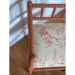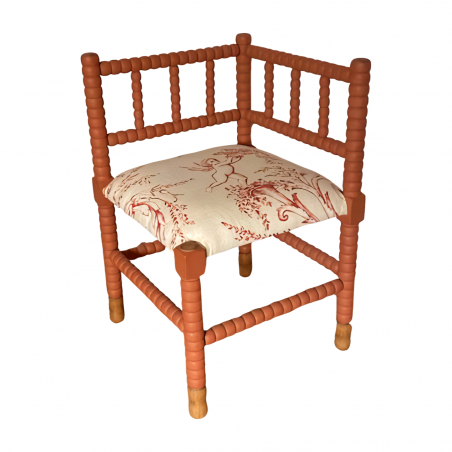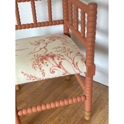 Chaise de coin en bois tourné perlé ancienne des années 50. Ce fauteuil à été modernisé par une assise mousse sur sangles, agrémentée d'un joli tissu Anglais de Jane Churchill vintage.