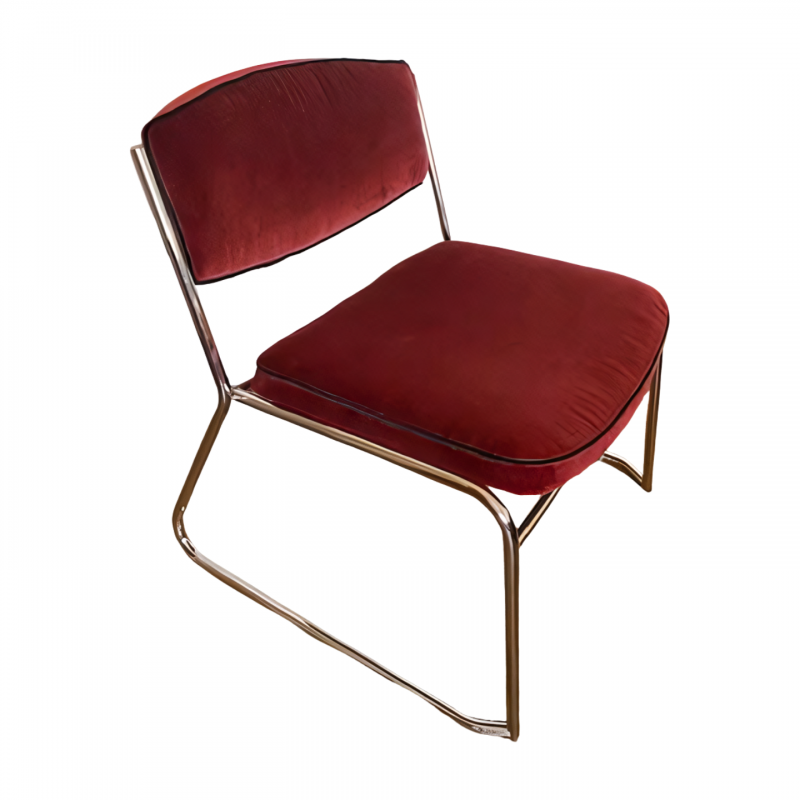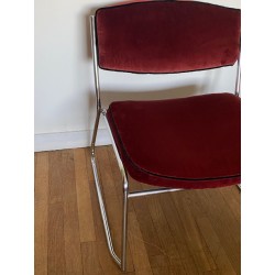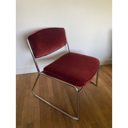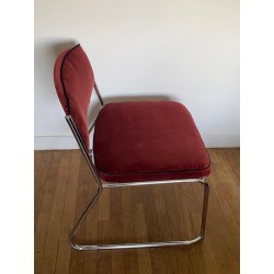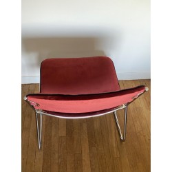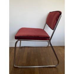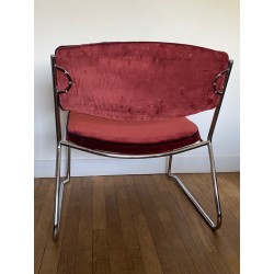 Chauffeuse design en métal chromé des années 70. Bon confort, dossier reposant qui prend bien les reins et assise large. Structure nettoyé en bon état. Changement des bouchons pieds sur l'avant. 2 paires possible. En velours de coton italien terracotta/bordeaux et grège avec passepoil noir.