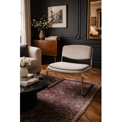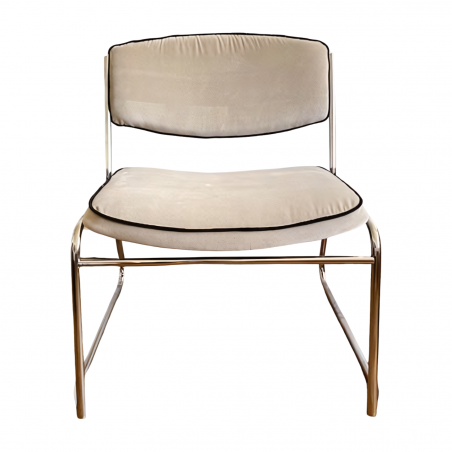 Chauffeuse design en métal chromé des années 70. Bon confort, dossier reposant qui prend bien les reins et assise large. Structure nettoyé en bon état.Changement des bouchons pieds sur l'avant. 2 paires possible. En velours de coton italien et passepoil noir terracotta et grège.