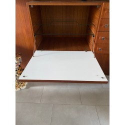 Rare éléments mural en teck des années 60 designer par Luigi Bartolini. 3 panneaux agrémentés de lumières avec bandeau bois, 3 étagères en verre et 3 en bois plein. Ainsi que 2 caissons: un bar/ secrétaire et un caisson commode/argentier.