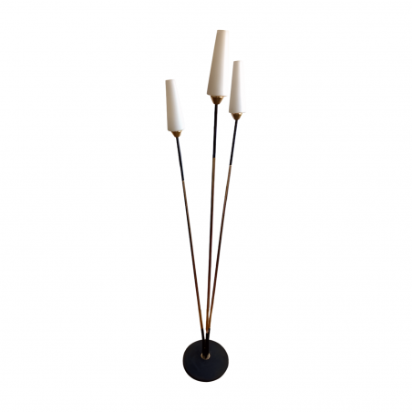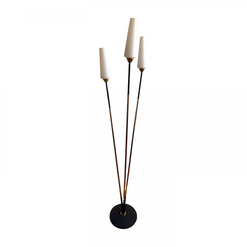 Lampadaire Stellor 3 feux de lumières en très bon état général. 3 tiges en métal dorées et noir mat aux extrémitées sur 15 cm. Ampoules B22. 3 opalines blanc mat. Allumage par bouton poussoir au sol. Lesté par un disque en fonte noir mat.