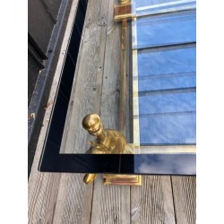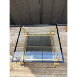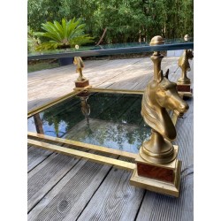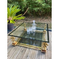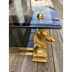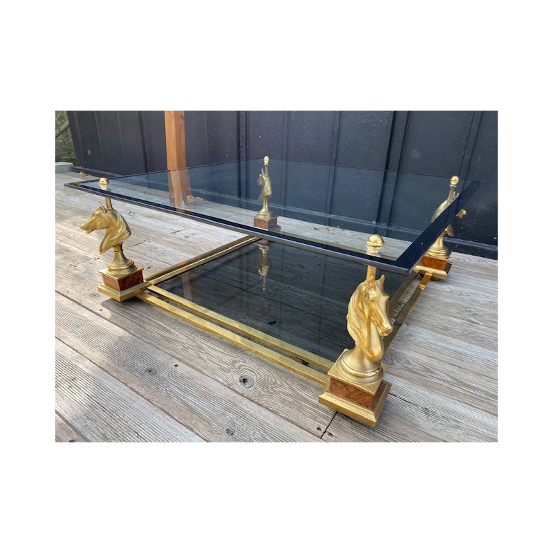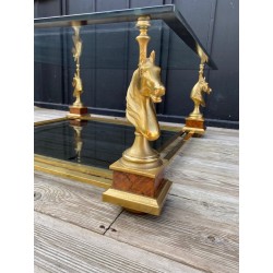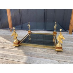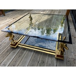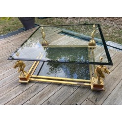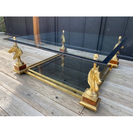VENDUE. Table basse de style néoclassique et dans le goût de la Maison Charles. Grande plaque de verre fixée par des demies sphères vissés, bordé d'un galon noir supporté par 4 bustes de chevaux en métal doré et piètement carré de bois façon thuya, qui se termine par une boule aplatie de bois massif teinté. Verre fumé gris en plateau de dessous.