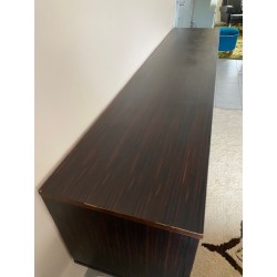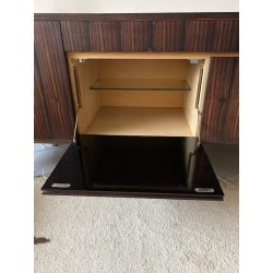 Enfilade palissandre de Paul Geoffroy distribué par Roche et Bobois dans les années 60. Une belle enfilade minimaliste avec son piètement sobre noir mat et chaussé de laiton. Son placage en façade a un joli effet de fil tiré. Intérieur en placage de frêne. Les ferrures en laiton et l'ouverture des portes avec un système push up, tout ses éléments sont un gage d'une grande qualité. Traces du temps sur une étagère en verre et sur le bord côté gauche du plateau (voir photos). L'ensemble est dans un bel état.
