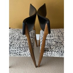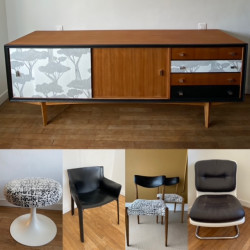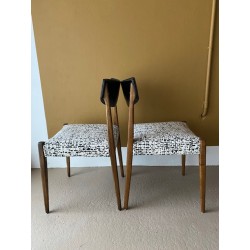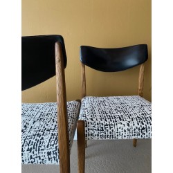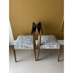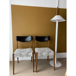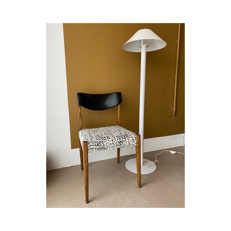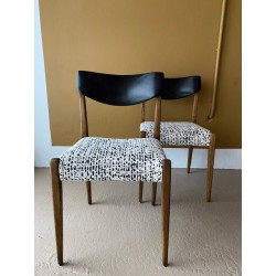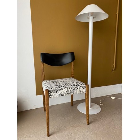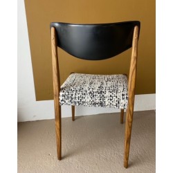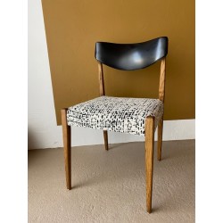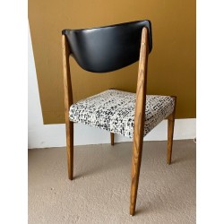 Chaise de style scandinave en bois de frêne teinté teck des années 60. Dossier "vague" en skaî d'origine noir et assise neuve mousse et tissu bouclette de la Maison Thévenon. Très bon état. Hauteur assise: 46 cm.