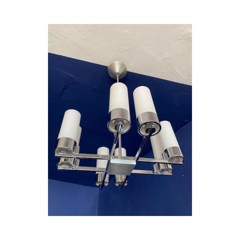 Lustre en métal chromé et 8 feux avec opaline blanc mat des années 70. Entièrement nettoyé . Prêt pour une nouvelle vie. Edition de la Maison Arlus.