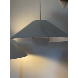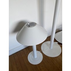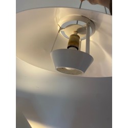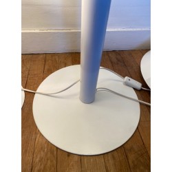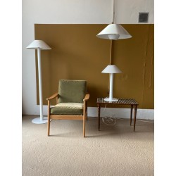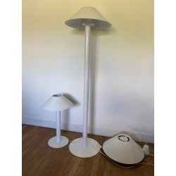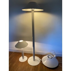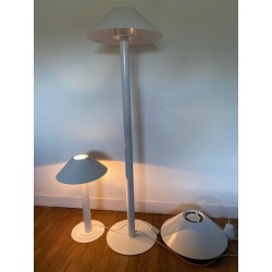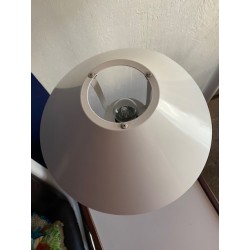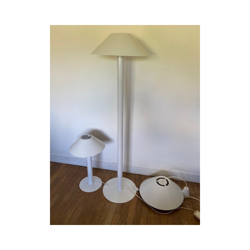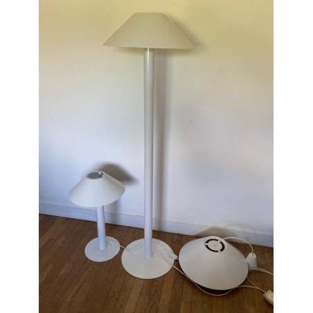 Lampadaire en métal édition Lyfa fabriqué au Danemark dans les années 70. Le lampadaire, sa lampe modèle Mobidam et la suspension sont le trio parfait pour créer une belle ambiance pour tous les styles d'intérieur. Quelques traces d'usages sur abat-jour intérieur de la lampe, ainsi que le dessus de l'abat-jour et le pied du lampadaire. Ampoule à vis B27.