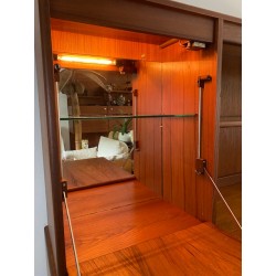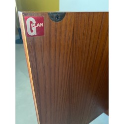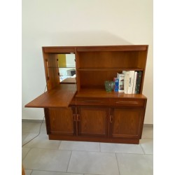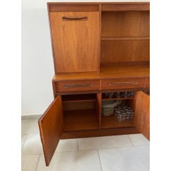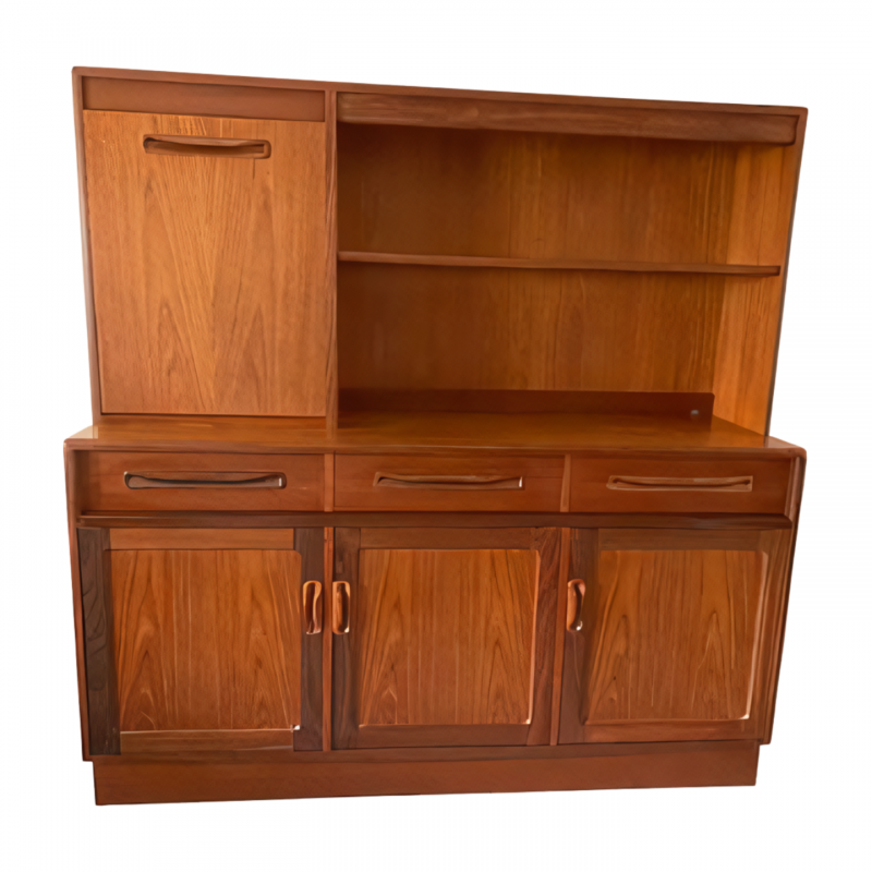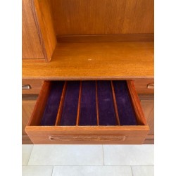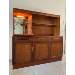 Buffet/ enfilade bibliothèque/bar en teck des années 60 édité par Gplan marque anglaise. Modèle Fresco designé par Victor Wilkins . L'étagère du haut est amovible (verre et bois) qui coulisse sur rail en fer. 2 lumière au dessus (néon non fournis). Montage des tiroirs en queues d'arondes. Partie basse une étagère dans chaque compartiment. La partie bar s'allume avec étagère en verre et un miroir dans le fond.