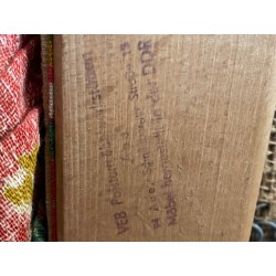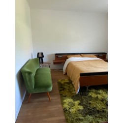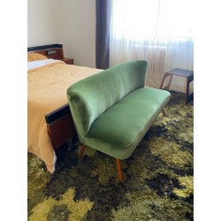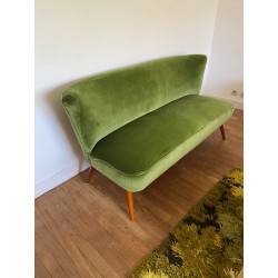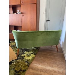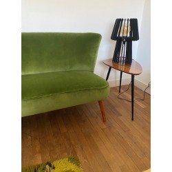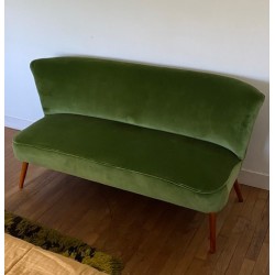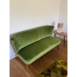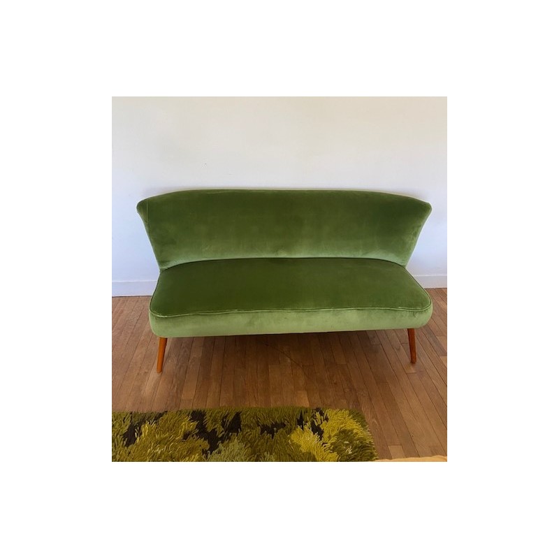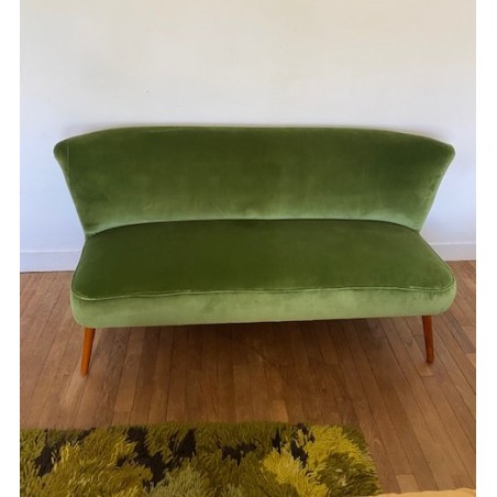 Canapé des années 50 dit "cocktail" de style scandinave mais fabriqué en Allemagne. Changement du tissu d'origine par un lumineux velours de coton vert. Pied hêtre teinté teck d'origine.