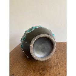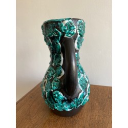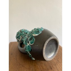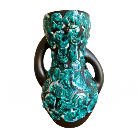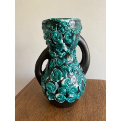 Vase deux anses fat lava en céramique des années 50. Noir mat et vert émeraude.